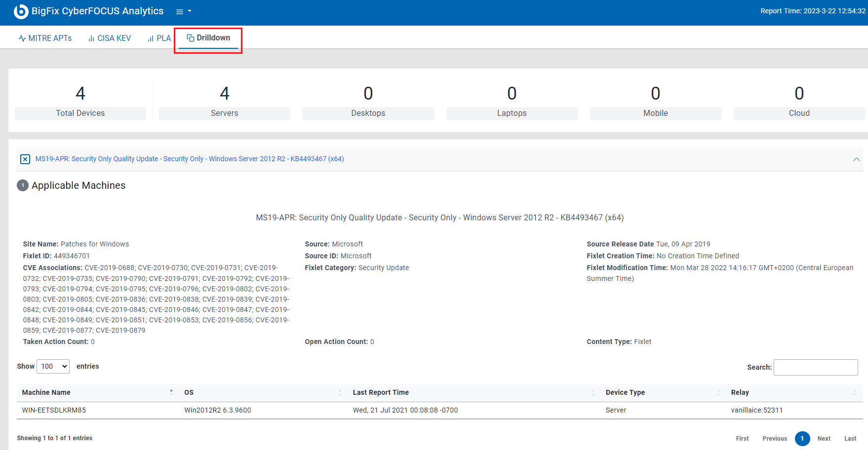 To enable Drilldown tab, in the MITRE or CISA KEV chart, click on the relevant Applicable Machines number in the CVE Table.