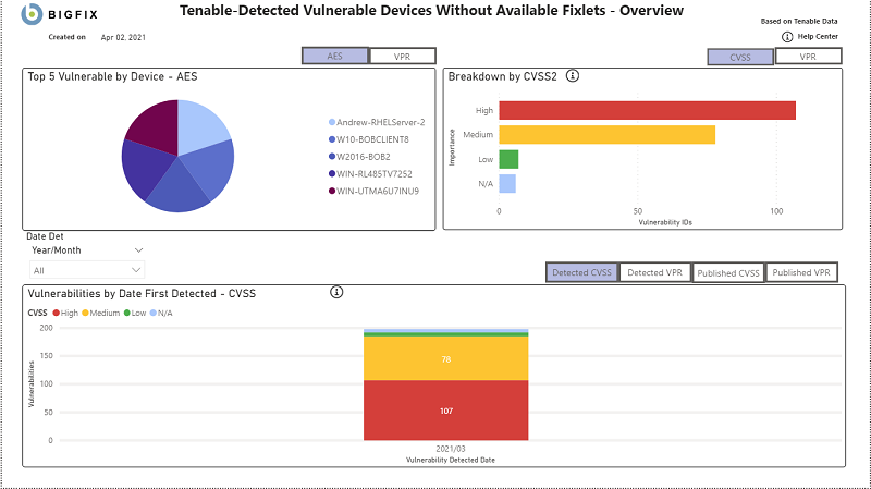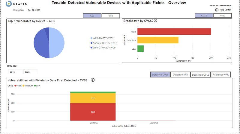 BigFix Insights for Vulnerability Remediation can consume vulnerability data from Tenable.io. With Tenable Lumin available, BigFix Insights for Vulnerability Remediation also consumes asset prioritization data:
