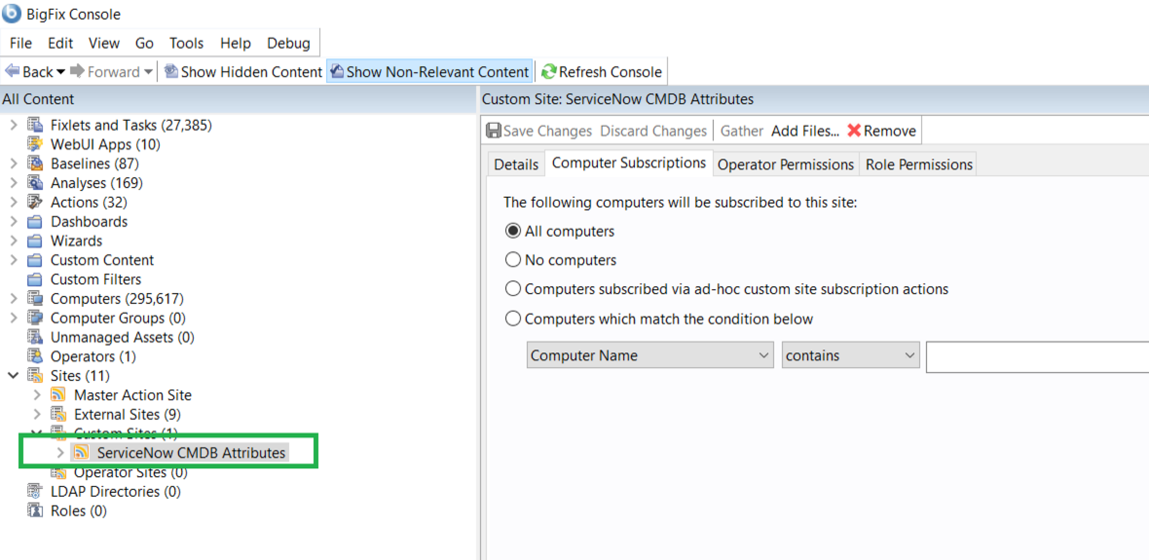 Go to Custom Sites and create a new site. Name it as ServiceNow CMDB Attributes and select All Computers in Computer Subscriptions.