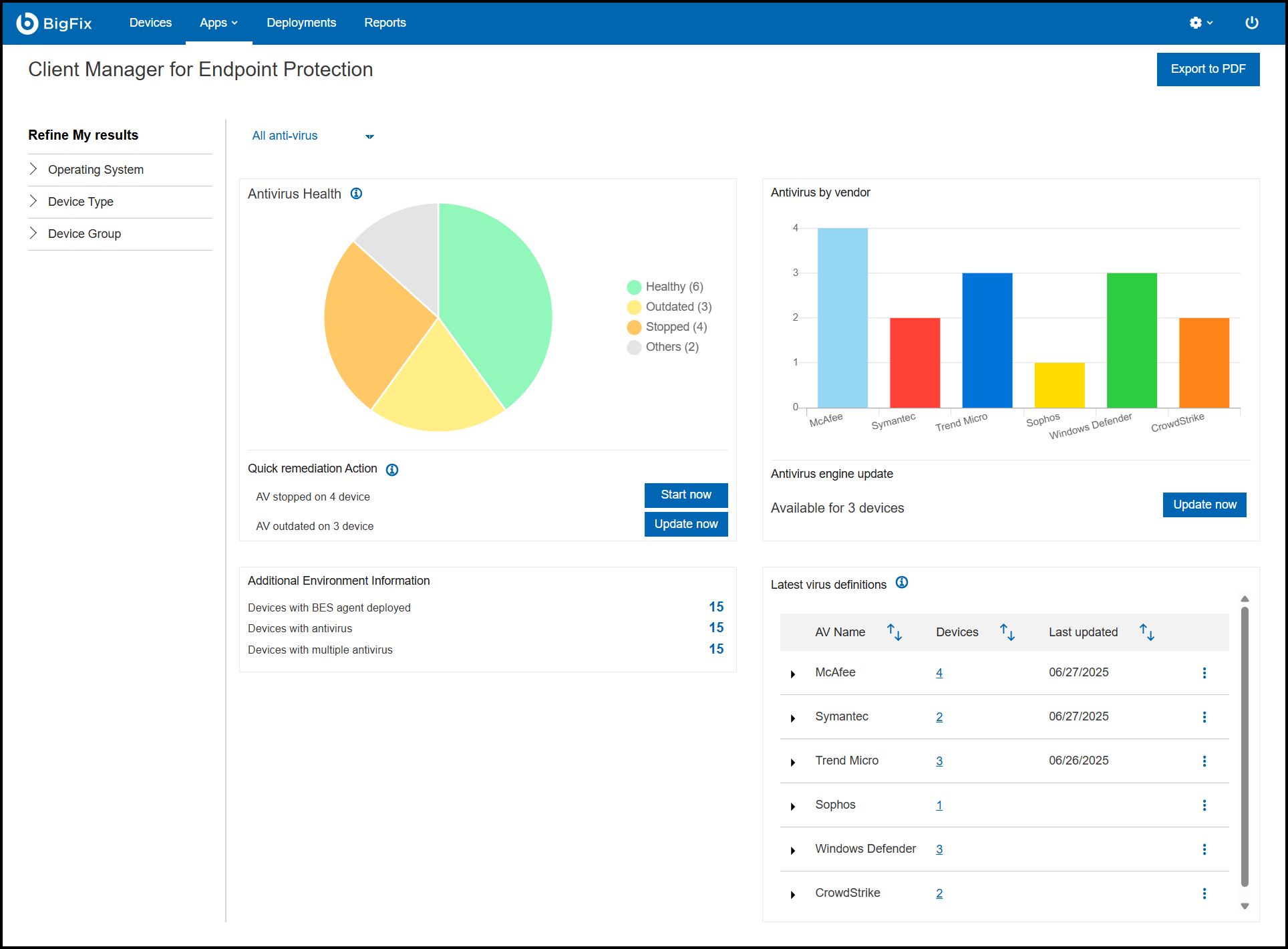 Note: The Deploy option is available if for any antivirus or if the version number of outdated devices is greater than 0. The CMEP App has predefined fixlets for certain antivirus versions, which can update the definition package of the product with those devices. With this option, you can deploy those fixlets for those devices and update the definition packages.