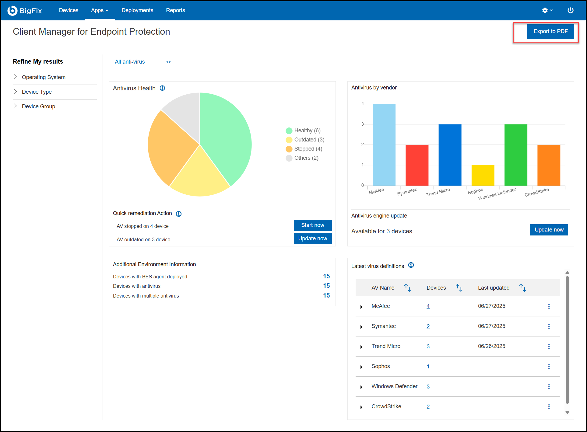 Use Export to PDF feature to save CMEP App overview or individual vendor dashboard reports.