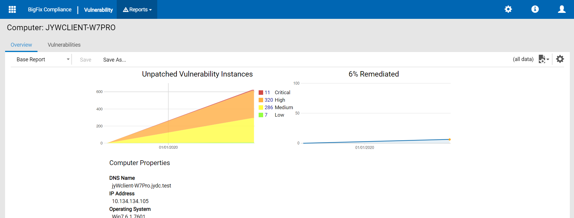 - The Computer Overview report represents a graphic representation of unpatched vulnerability instances, computer properties and % remediated.