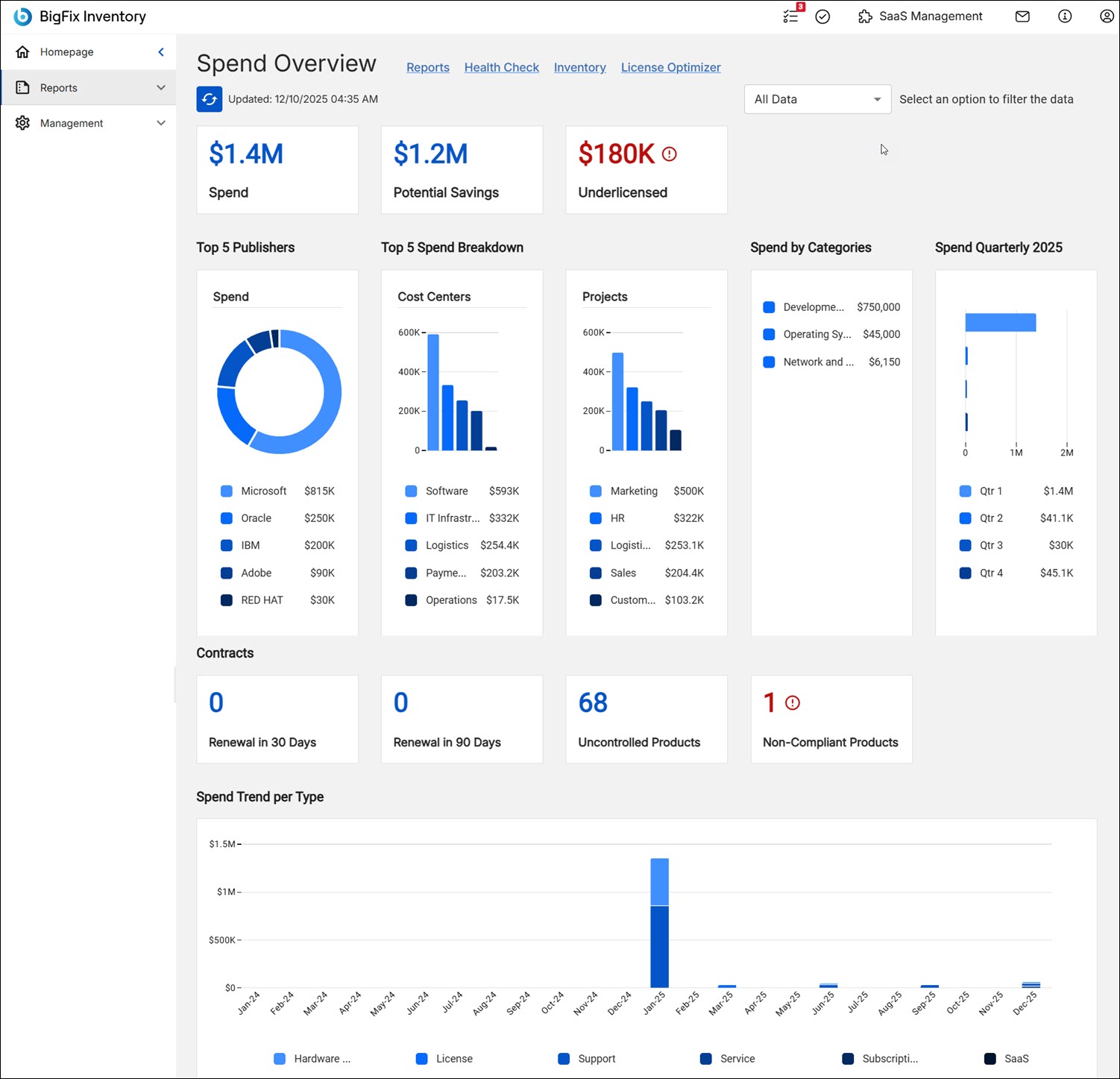 The Spend dashboard in BigFix Inventory provides a comprehensive view of software and hardware usage costs. It enables you to track and analyze software spend, optimize license utilization, and manage budget allocation effectively. The dashboard displays key financial metrics, such as license compliance, cost breakdowns, and trends, helping organizations make informed decisions about software investments.