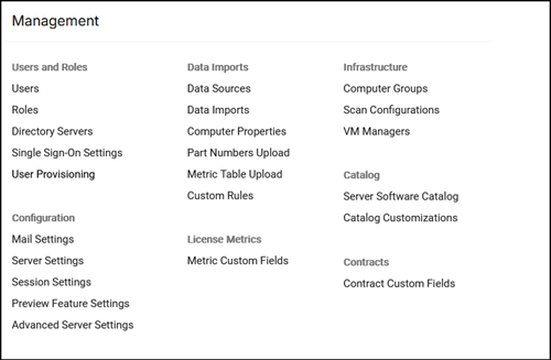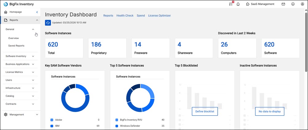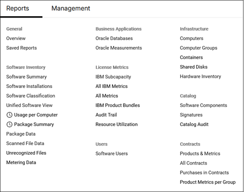 Since BigFix Inventory version 11.0.6, the main application menu (Reports and Management sections) was moved to the left navigation section, providing an option to collapse it and with an additional link to the homepage, while preserving the menu structure.