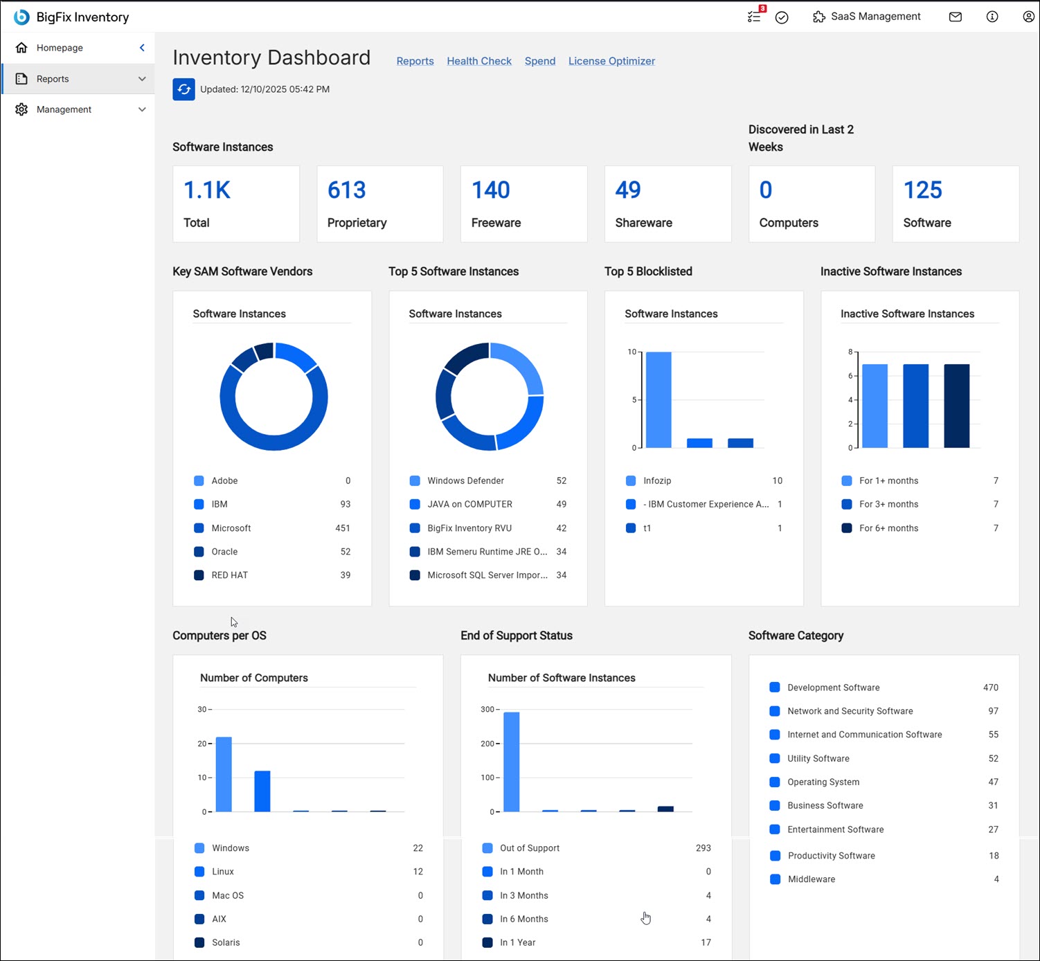 With version 11.0.4, BigFix Inventory brings a new 'Inventory Dashboard' which provides overall and breakdown data about your software database. The new dashboard is displayed by default if the preferred homepage is not set and you have the required permissions to view it.