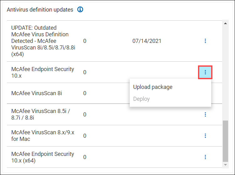 - アンチウィルス定義の更新: このコンポーネントには、ベンダーの製品名とバージョン番号、インストールされているデバイスの数、最終更新日が表示されます。次のスクリーンショットに示すように、垂直の省略符号をクリックすると、アンチウィルス定義パッケージを更新したり、デプロイしたりすることもできます。パッケージのアップロードおよびパッケージのデプロイについて詳しくは、「最新のアンチウィルス定義のデプロイ」を参照してください。