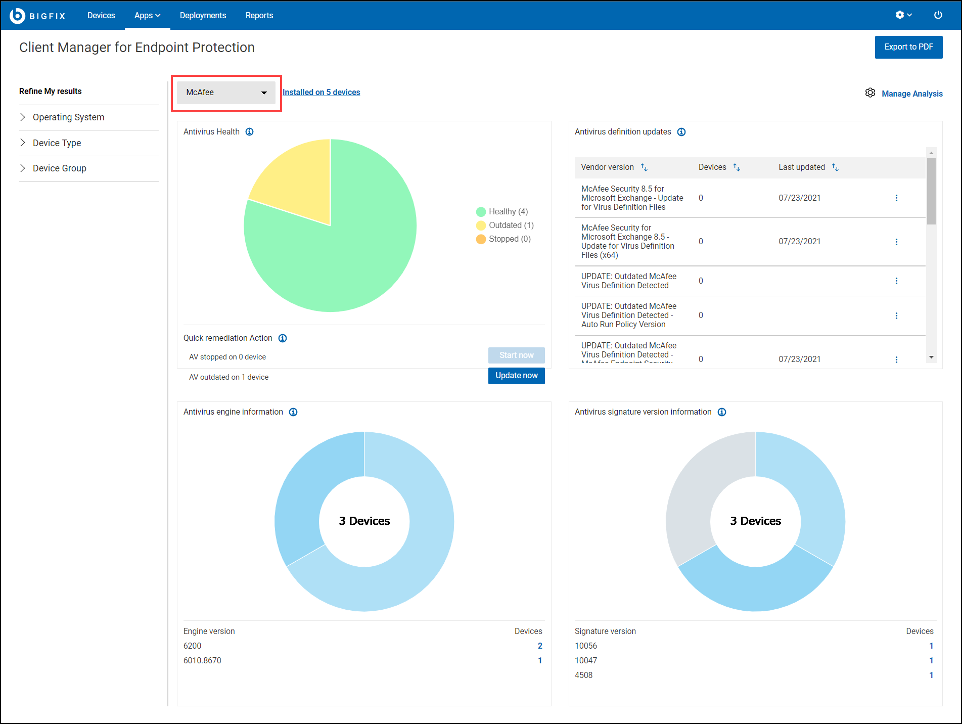 個々のベンダー・ダッシュボードを表示するには、CMEP アプリケーションの概要ページで「すべてのアンチウィルス」ドロップダウン・メニューをクリックし、アンチウィルス・ベンダーを選択します。図 2. McAfee ダッシュボード