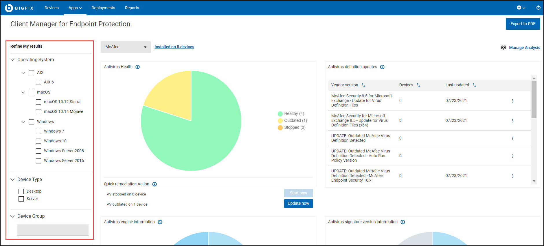 - デバイス・タイプ: デバイスの正常性ステータス、デプロイメント統計、ベンダー・インストール統計などの情報をフィルタリングできます。