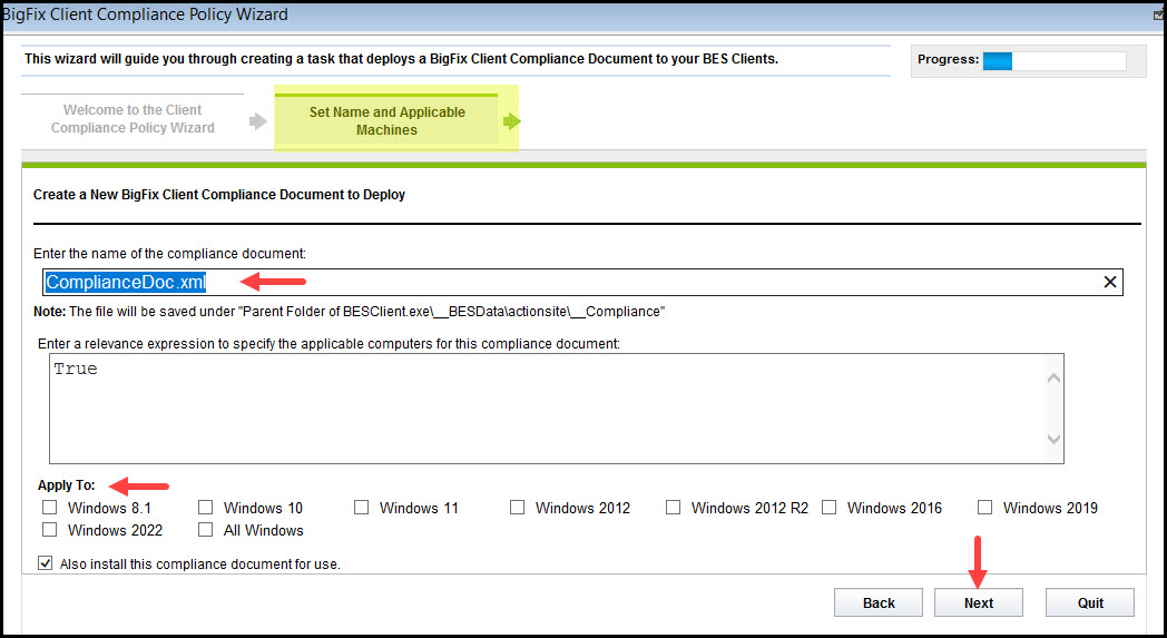 BigFix Client Compliance ポリシー・ウィザードを使用して、新しいポリシー・ドキュメントを作成し、ポリシーを 1 台以上のコンピューター、またはクライアント・エンドポイントにデプロイします。