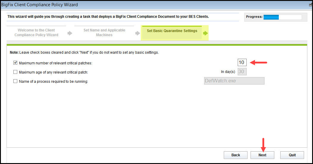「基本検疫設定」タブで、リストから必要な設定を確認し、そのパラメーターを定義して「次へ」をクリックします。たとえば、「関連する重要なパッチの最大数」をオンにして、そのパラメーターを定義します。