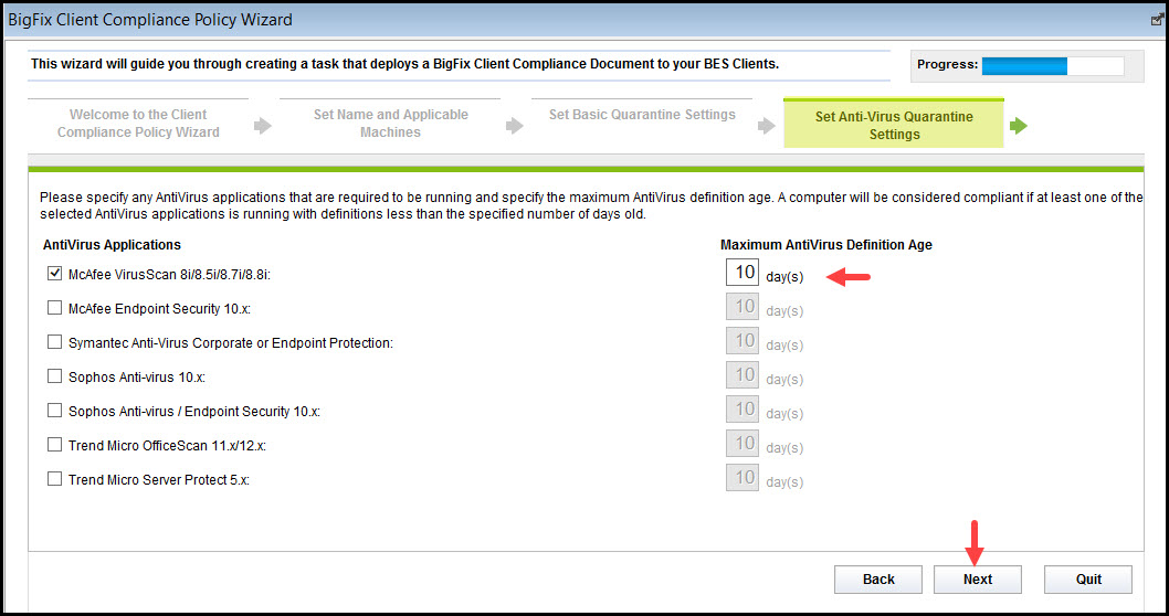 「アンチウィルス検疫設定の設定」タブで、リストから必要なアンチウィルス・アプリケーションを確認し、最大有効期限を日数で定義して、「次へ」をクリックします。