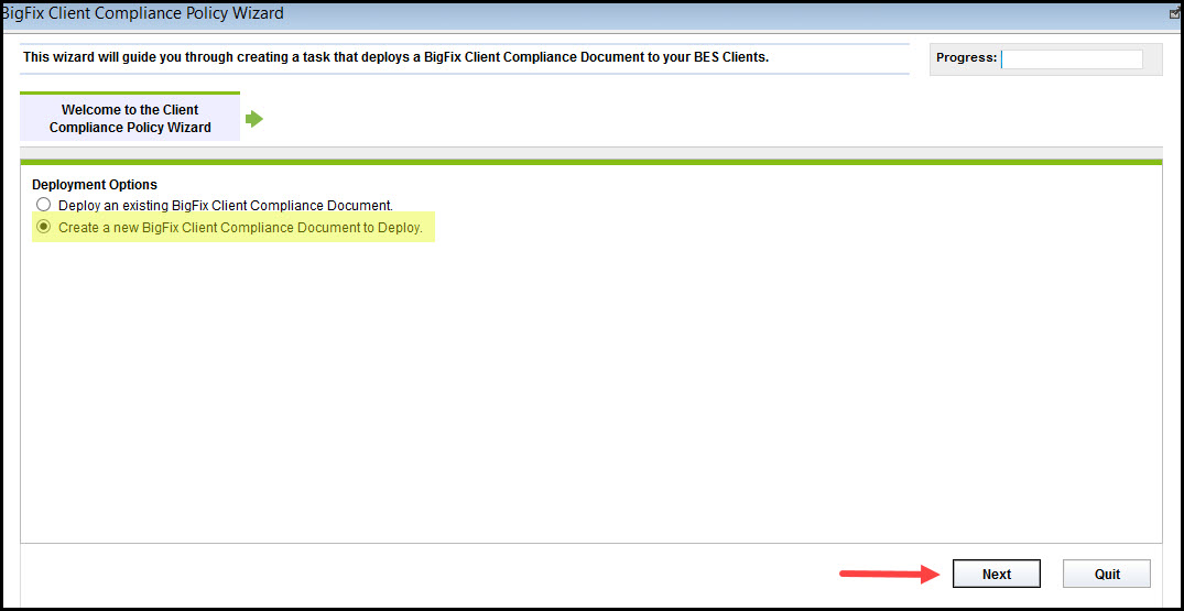 「クライアント・コンプライアンス・ポリシー・ウィザードへようこそ」タブで、「既存の BigFix コンプライアンス・ドキュメントのデプロイ」を選択し、「次へ」をクリックします。