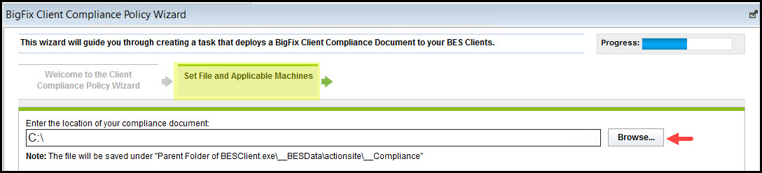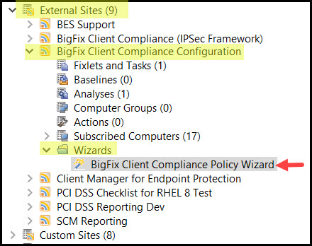 BigFix Client Compliance ポリシー・ウィザードにアクセスするには、ナビゲーション・ツリーから」を選択します。