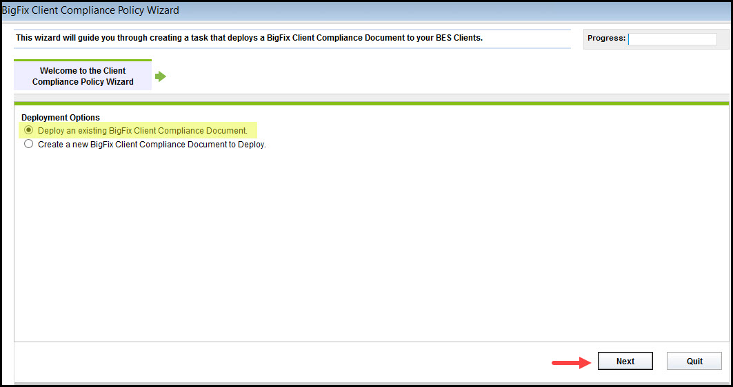 「クライアント・コンプライアンス・ポリシー・ウィザードへようこそ」タブで、「既存の BigFix コンプライアンス・ドキュメントのデプロイ」を選択し、「次へ」をクリックします。