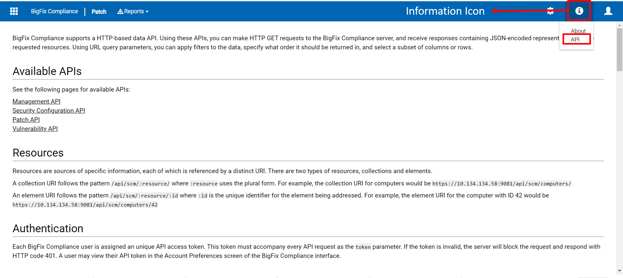 API の詳細については、ヘッダーの「情報」アイコンをクリックし、ドロップダウンから「API」を選択します。