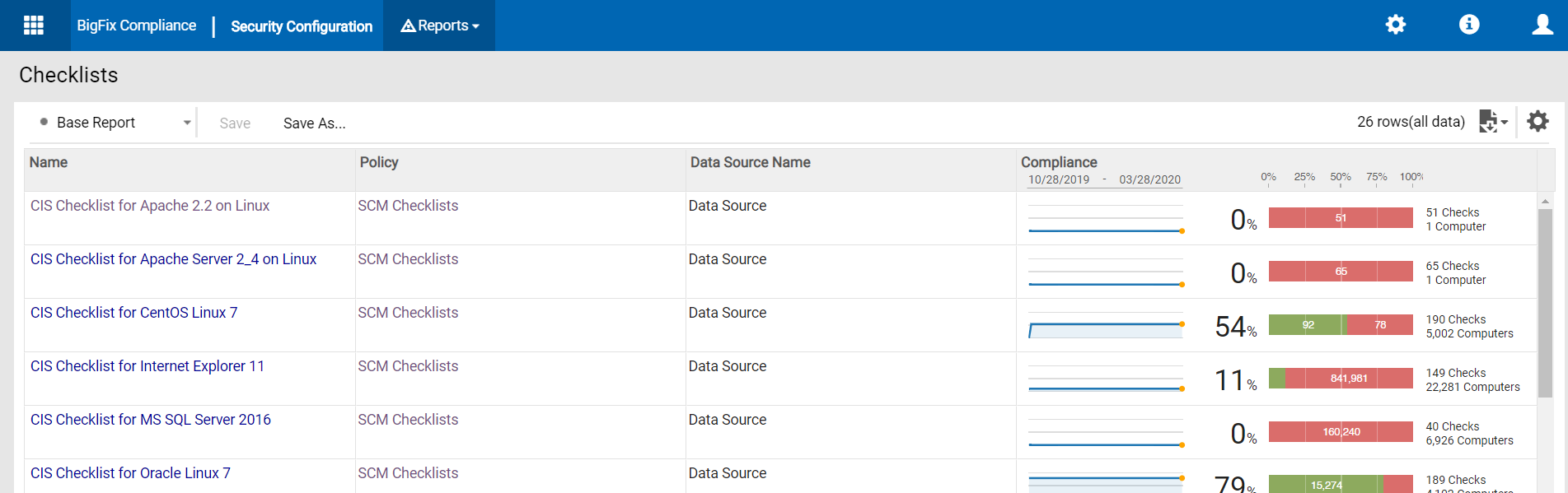 チェックリストのレポート 「ドメイン」を使用して「セキュリティー構成」ドメインを選択し、「レポート」をクリックして次のレポートを検索します。 チェックリスト チェックリスト、ポリシー、データ・ソース名、これまでの全体的なコンプライアンス結果の集計のリスト・ビューが表示されます。