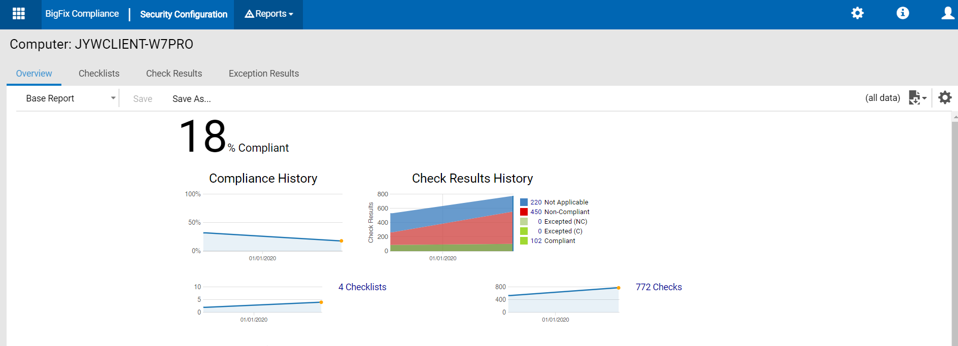 コンピューターの概要レポート 「コンピューター概要」レポートにアクセスするには、リスト・ビューに表示される任意のコンピューターをクリックします。 コンピューター概要レポート コンピューター概要レポートには、コンプライアンスの履歴、コンピューターのプロパティー、チェック結果の履歴がグラフィック表示され、コンプライアンス全体の割合がコンソールの左上隅に示されます。