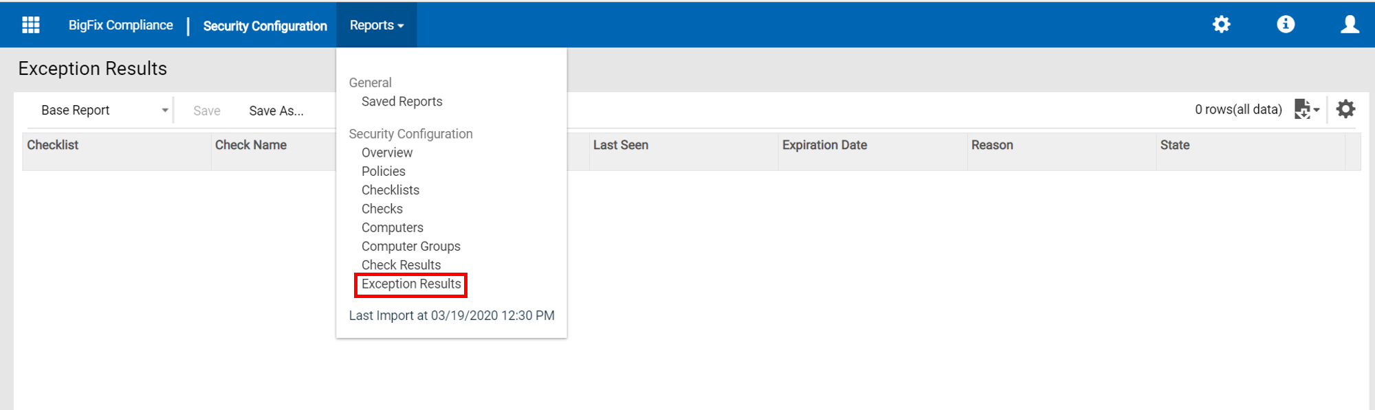 「例外結果」レポートでは、チェックリスト、チェック名、前回表示日時、有効期限理由、状態のリスト・ビューが表示されます。
