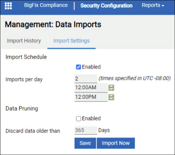 「インポート設定」タブを使用すると、繰り返しインポートのスケジュール、繰り返しインポートの無効化、手動インポートの開始、現在のインポートの表示を実行できます。