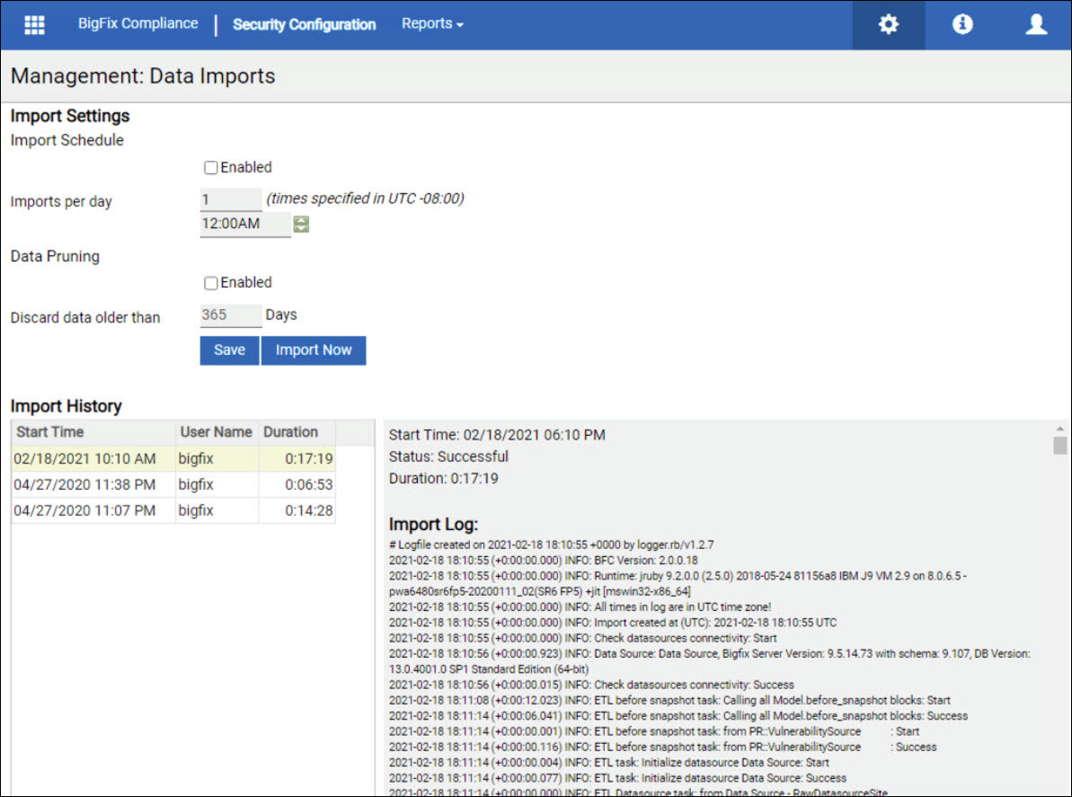 「インポート設定」タブの「今すぐインポート」をクリックして、即座のインポートを実行します。繰り返しインポートをスケジュールするには、最初にウィンドウの上部にある「インポート」ボックスにチェック・マークを入れ、希望する毎日の開始時刻を設定します。