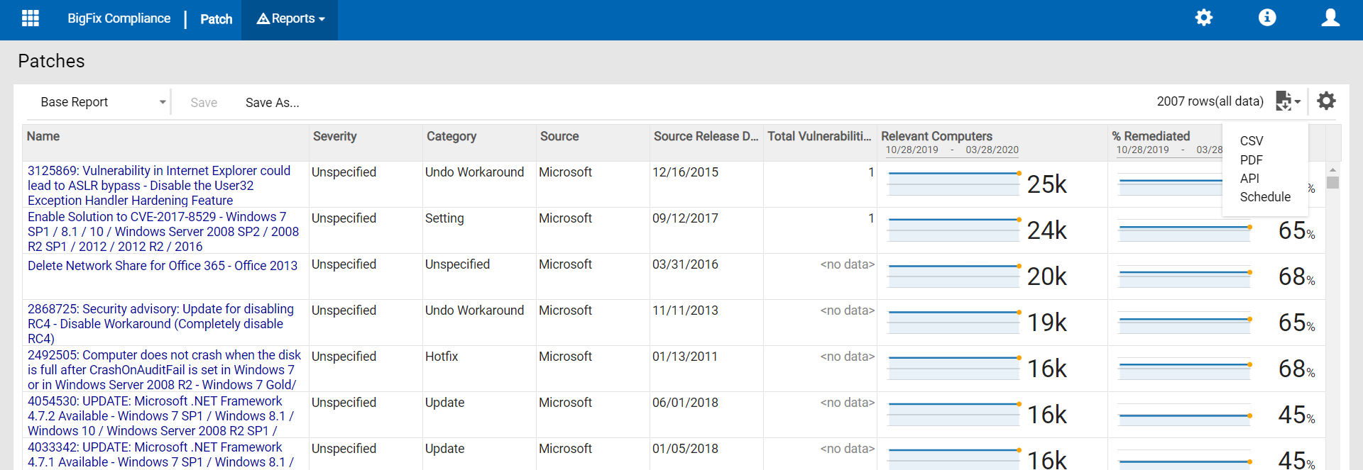 「パッチ」レポート 「ドメイン」を使用してパッチ・ドメインを選択し、「レポート」をクリックして次のレポートを検索します。 パッチ パッチ、重大度、カテゴリー、ソース、ソースのリリース日、合計脆弱性、関連するコンピューター、修復済みの割合のリスト・ビューが表示されます。