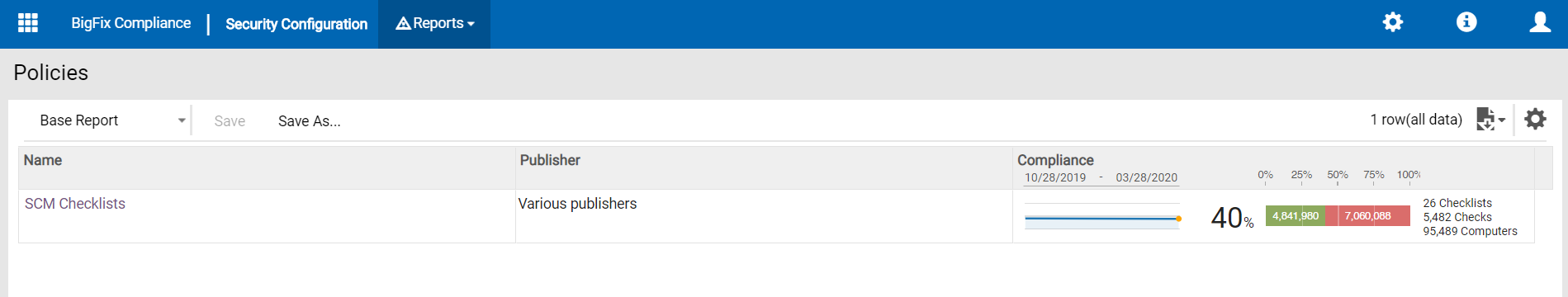 「ポリシー」レポート 「ドメイン」を使用して「セキュリティー構成」ドメインを選択し、「レポート」をクリックして次のレポートを検索します。 ポリシー デプロイ済みのポリシー、パブリッシャーの詳細、ポリシーの説明、これまでの全体的なコンプライアンス結果の集計のリスト・ビューが表示されます。