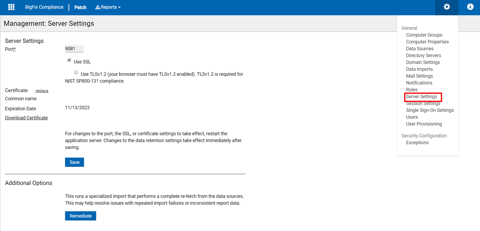 サーバー設定 HTTP ポート、SSL、TLS を構成したり、データ保持を有効化または無効化したりするには、「サーバー設定」を使用します。ポートまたは SSL 設定を変更した場合は、サービスを再起動する必要があります。