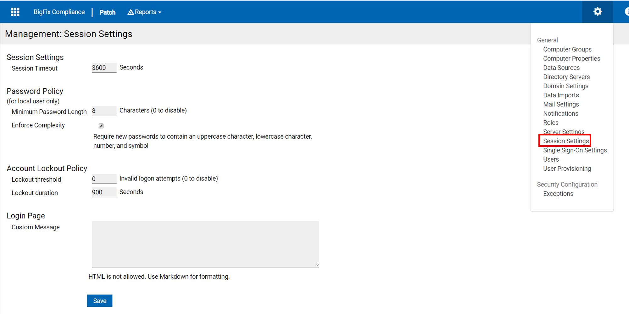 セッション設定を変更して、一定期間非アクティブになっているログイン・ユーザーのセッション時間を指定したり、Markdown テキストを使用してログイン・ページのメッセージをカスタマイズしたりできます。