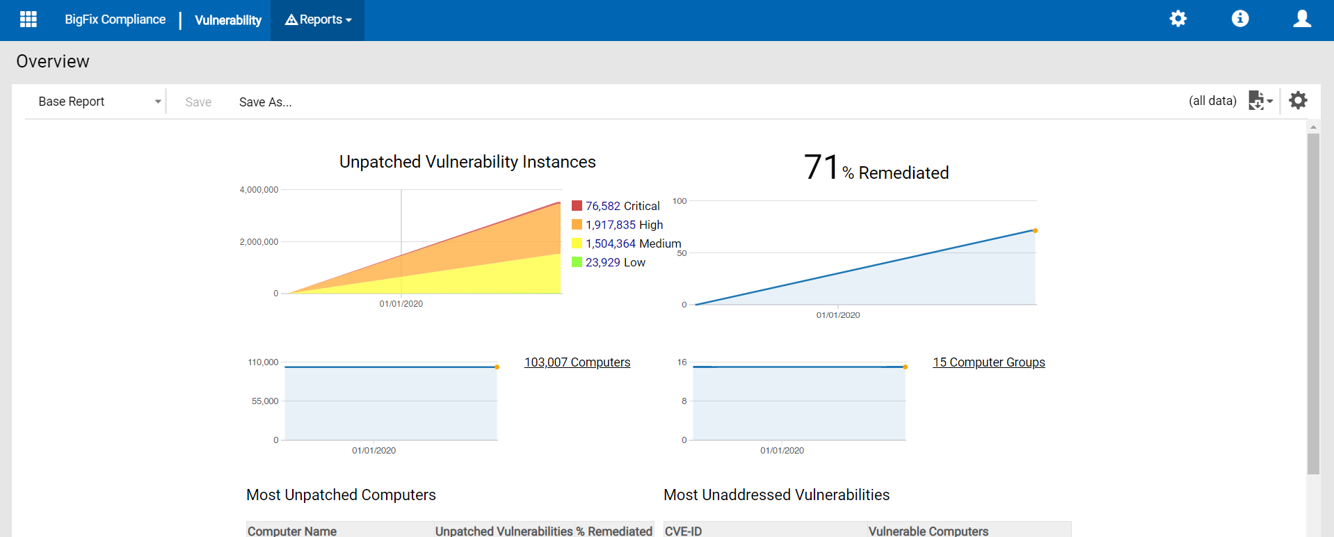 「脆弱性」ドメイン・ダッシュボードの主要な「概要」ウィンドウでは、次のグラフィカル・レポートを使用できます。