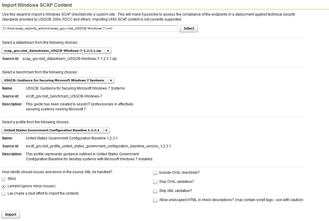 - 「選択」を使用してインポートする XCCDF ファイルを選択します。