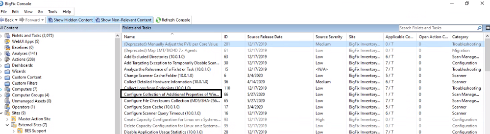 - 「スキャナーのインストールまたはアップグレード」Fixlet を使用して、スキャナーを HCL スキャナーにアップグレードします。このスキャナーへのアップグレードは、BigFix Inventory がスキャナーの唯一の利用者である場合に使用できます。または、「Windows のプライベート・モードでのスキャナーのインストールまたはアップグレード」Fixlet を使用できます。