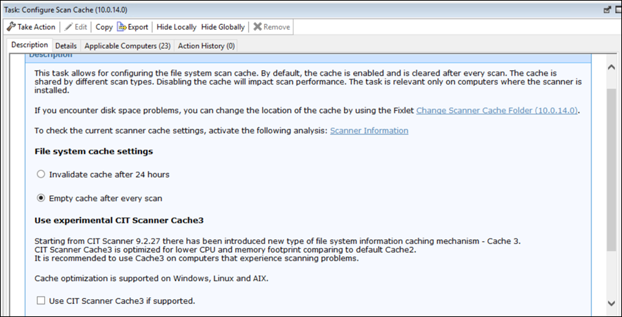 重要: アプリケーション更新 9.2.6 以降では、フレッシュ・インストールで最適化が有効に設定されています。ただし、アップグレードしている場合、スキャナー・キャッシュ設定は変更されません。特定のコンピューターでスキャン最適化が有効になっているかどうかを確認するには、これらの手順を実行します。