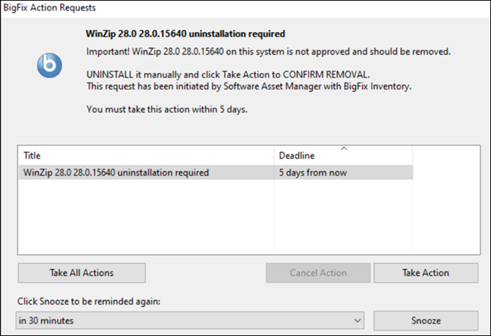 - BigFix Inventory が BigFix Platform にアンインストール要求を送信できるようにするには、このオプションを使用します。ソフトウェアがアンインストールの対象でない場合は、警告メッセージが表示されます。