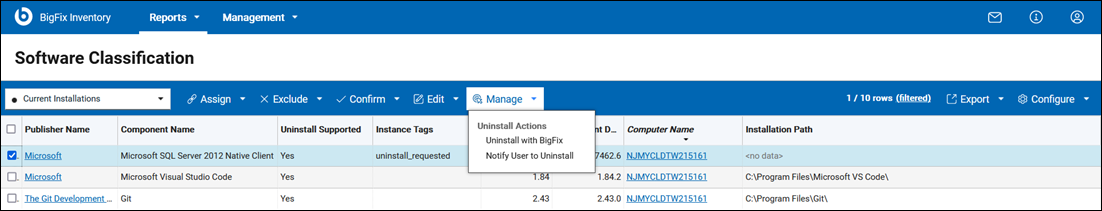 「ソフトウェア分類」パネルには、以下の 2 つのオプションを持つ「管理」メニューが含まれています。「BigFix でアンインストール」および「アンインストールするようにユーザーに通知」です。これらのオプションを使用して、ソフトウェアのアンインストールを要求するか、ソフトウェアをアンインストールする通知を送信できます。