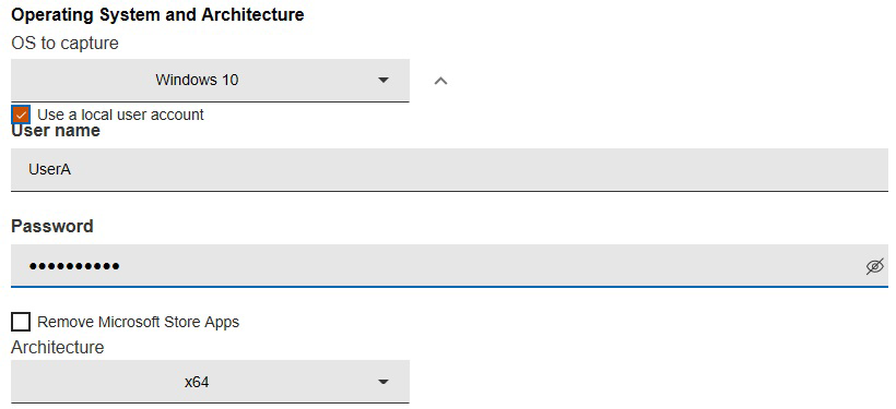 または、Microsoft Store ベースのアプリケーションの更新を実行した同じローカル・ユーザーを使用してキャプチャー・タスクを実行することもできます。ただし、イメージを正常にキャプチャーする前に、それらの一部をアンインストールする必要がある場合があります。任意で、キャプチャー・タスク中に Microsoft Store ベースのアプリケーションを削除するためのチェック・ボックスを選択できます。Windows 10 の場合は、3.10.21 より後の MDT Bundle が必要です。Windows 11 の場合は、3.10.41 以降の MDT Bundle が必要です。