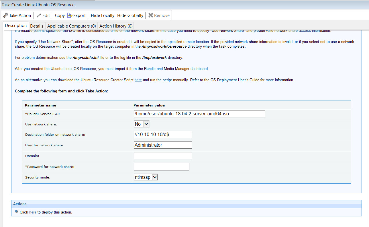 タスクの説明に従って、フィールドに値を入力します。事前にダウンロードした Ubuntu Server ISO ファイルを指定する必要があります。最初の手順で ISO ファイルをダウンロードする際に使用した Ubuntu マシンにアクションをデプロイします。注:Ubuntu リソースは手動で作成することもできます。そのためには、リソース・ツール・スクリプトをダウンロードして実行します (Ubuntu OS リソースの手動作成を参照)。- 1Ubuntu リソースを作成するには、genisoimage パッケージがインストールされている必要があります。