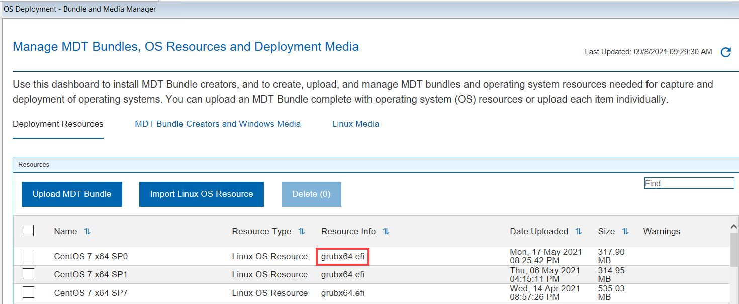 次の図に示すように、対応する Linux OS リソースに、grubx64.efi または grub.efi フラグが設定されていることを確認します。付いていない場合は、Linux OS リソースを再インポートできます。そうでなければ、サポートされるすべての Linux オペレーティング・システムの場合、「UEFI ターゲットでの Linux デプロイメント用の grub2 ブート・ローダーの使用」の説明に従って grub2 ローダーを使用することもできます。