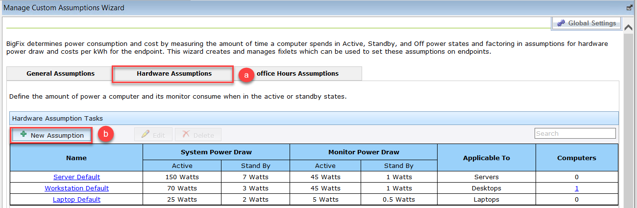 「ハードウェア想定値」タブで、アクティブ・モードまたはスタンバイ・モードでのエンドポイント消費電力を定義します。