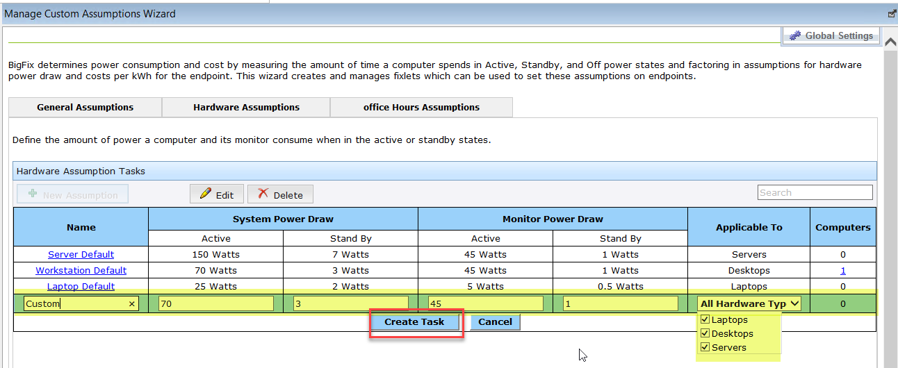 「新規想定値」をクリックすると、ウィンドウの下部に追加行が表示されます。そこで、新しいタスクの「名前」、「システムの消費電力」、「モニターの消費電力」、各種ハードウェア・タイプの適用条件に対応するフィールドに手動で入力できます。完了したら、「タスクの作成」をクリックして、「OK」をクリックし、「秘密鍵のパスワード」を入力します。タスク・ウィンドウの「アクション」ボックス内をクリックして、アクションをデプロイします。