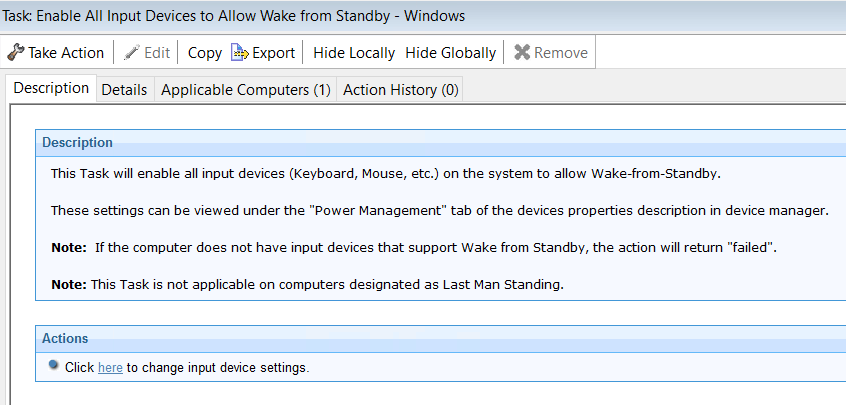 ユーザー対話によってコンピューターをスタンバイ状態からウェークできるのは、一部の入力デバイスのみであり、なおかつ、正しい Windows 設定が有効になっている場合に限られます。このタスクは、ウェーク可能なすべての入力デバイスを検索し、それらが Wake-from-Standby を実行できるようにします。