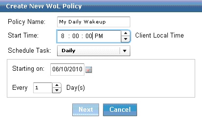 「Wake-On-LAN をスケジュール」ウィザード を使用して、スケジュールされたウェークアップを作成し、保守できます。スケジュールされたウェイクアップは、クライアントのローカル時間で実行され、実行にはアクションも特別なルーター構成も使用する必要はありません。