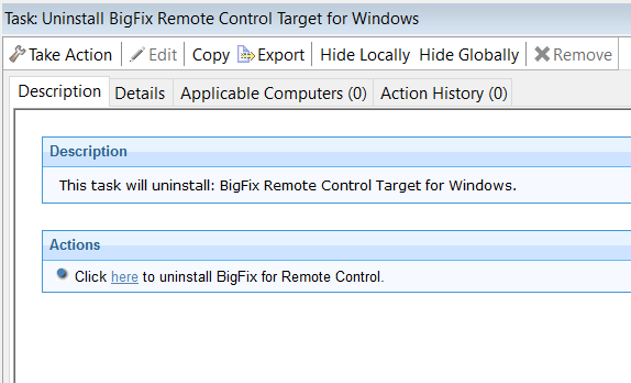 「Remote Control ターゲット (Windows 版) のアンインストール」タスクを使用すると、ターゲット・ソフトウェアが既にインストールされている Windows® コンピューターからターゲット・ソフトウェアを削除できます。