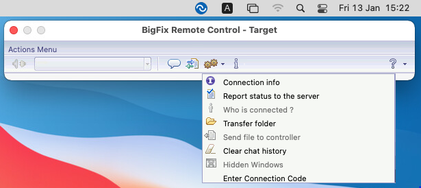タスク・バーの Remote Control ターゲット・アイコンをクリックすると、macOS 用 BigFix® Remote Control ターゲットのターゲット・ユーザー・インターフェースが開き、他のアプリケーション・ウィンドウの前に表示されます。