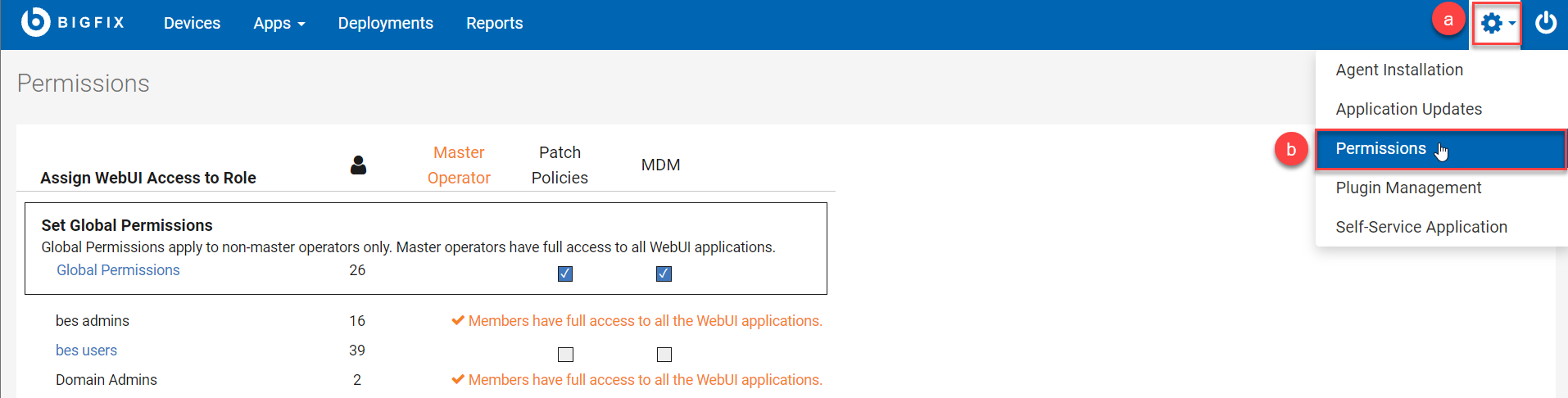 - WebUI にマスター以外のオペレーターとしてアクセスして、モバイル・デバイスとデバイス管理ポリシーを表示 (読み取り専用) できるユーザー。マスター・オペレーターによって管理を許可されたコンピューターのサブセットに対する Fixlet の管理やアクションの適用などを含む、BigFix の日常的な操作を管理します。他のオペレーターを作成することも、管理権限を割り当てることもできません。 https://help.hcl-software.com/bigfix/11.0/platform/Platform/Console/c_roles.html