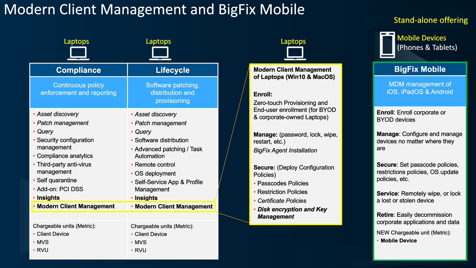- MCM and BigFix Mobile はラップトップとモバイル・デバイスの両方で使用可能な一般的な機能およびサービスを表します。