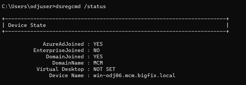 - AzureAdJoined と DomainJoined の両方で、デバイス登録ステータスが「YES」になっているかどうかを確認します。
