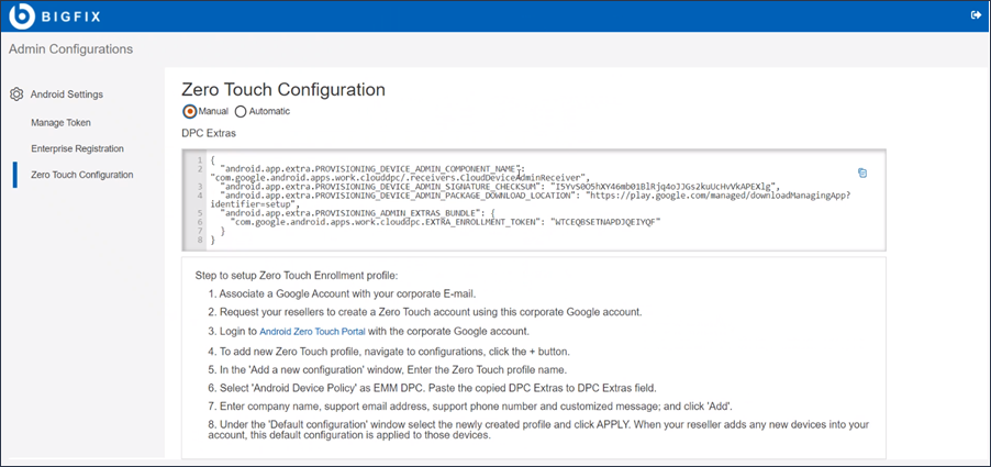 - 「DPC Extras」フィールドで、コピーした DPC Extras 値を入力します。Note: DPC Extras は から取得できますゼロタッチを構成するパネルで、「手動」を選択し、DPC Extra 値をコピーします。「DPC Extra」フィールドが空白の場合、IT 管理者はトークンを要求し、「Manage Token」ページでトークン・ファイルをアップロードし (左側のパネルで「Manage Token」をクリック)、トークンを BigFix Mobile に登録する必要があります。これを実行すると、DPC Extra 値が表示されるようになります。