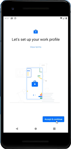 次の画面で、業務用プロファイルのセットアップを開始するには、「同意して続行」をクリックします。仕事用プロファイルに関連付けられたデプロイ済みポリシー・グループに基づいて、仕事用アプリケーションとデータがデバイスにデプロイされます。