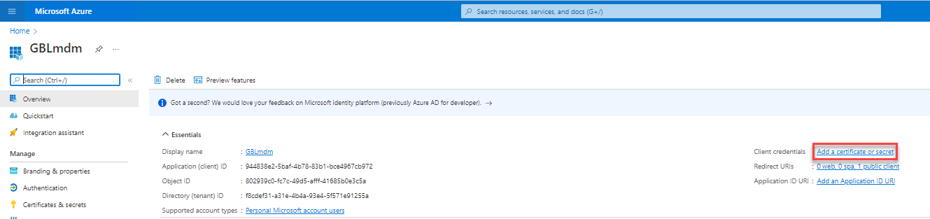 アプリの Microsoft Azure ポータル・ページが表示されます。「クライアントの資格情報」リンクをクリックして、証明書またはシークレットを追加します。