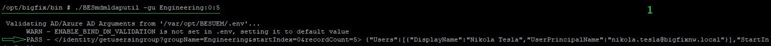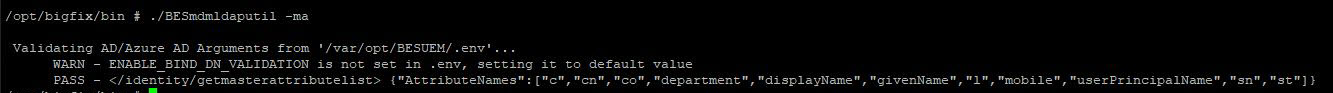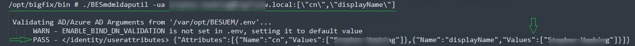 docker exec -it idservice /opt/bigfix/bin/BESmdmldaputil -ua testuser@test.com:[\"displayName\",\"cn\"]
